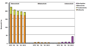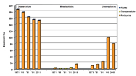 In den Buchenwäldern ist der beigemischte Eichenanteil durchweg zurückgegangen. Zu drastischen Rückgängen kam es z. B. in der NWZ Rehsol: hier reduzierte sich der Eichenanteil im 40jährigen Untersuchungszeitraum um 15 % von 52 % auf 37 %. Die Buche steigerte ihren Anteil von 42 % auf 62 %.