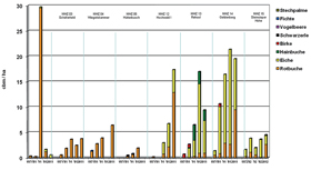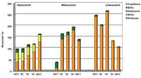 Abb. 7: 40 Jahre Entwicklung stehenden Totholzes (cbm/ha) - Buchenwälder nach Baumarten