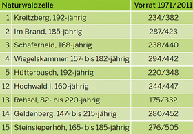 Insgesamt ist ein teilweise starker Anstieg des Holzvorrates zu beobachten. Zu Beginn wurden Vorräte um 200 Vfm/ha in den Buchenwäldern ermittelt. 40 Jahre später lagen sie zwischen 332 und 505 Vfm/ha. Es gab Steigerungen bis über 90 %. Die Eichenwälder starteten in der Regel mit Vorräten unter 200 Vfm/ha. 2011 bewegten sich die Vorräte zwischen 264 und 371 Vfm/ha. Es zeigten sich Anstiege bis 71 %.