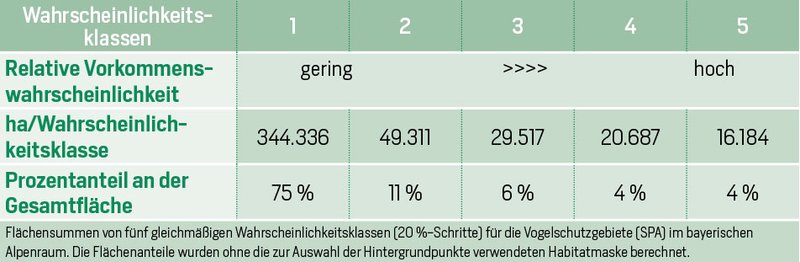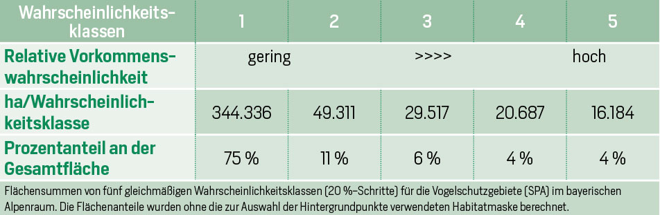 Teilt man die modellierten Flächen nach der Vorkommenswahrscheinlichkeit des Auerhuhns von 0 bis 100 % in fünf gleich große Klassen ein, so ergeben sich für das Wuchsgebiet 15 von der niedrigsten zur höchsten Klasse Flächenanteile von 75, 11, 6, 4 und 4 % (siehe Tab. 2). Gebiete mit sehr hohen Vorkommenswahrscheinlichkeiten des Auerhuhns haben also nur geringe Flächenanteile. Dies entspricht auch den Erfahrungen aus den Natura-2000-Kartierungen, wonach wirklich gut geeignete Habitate (Auerhuhn-Vorrangflächen) nur ca. 12 % der Schutzgebietskulisse einnehmen.