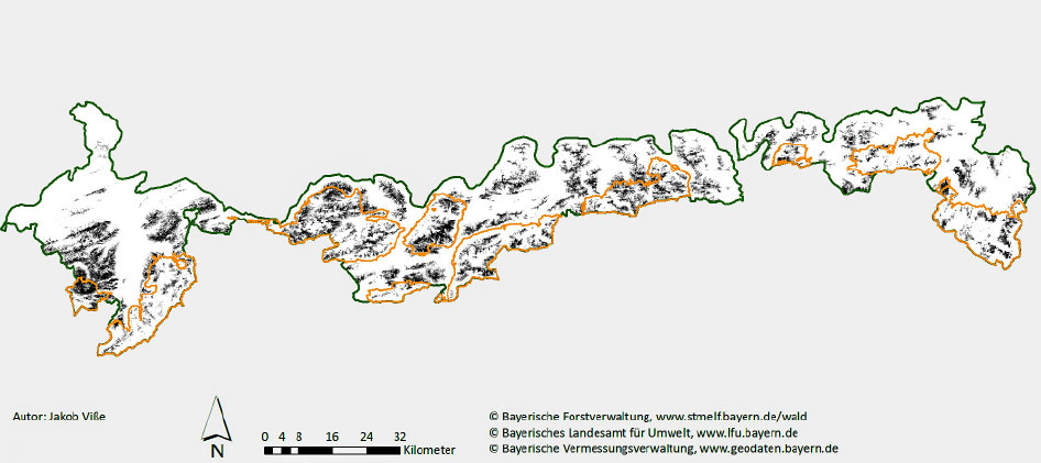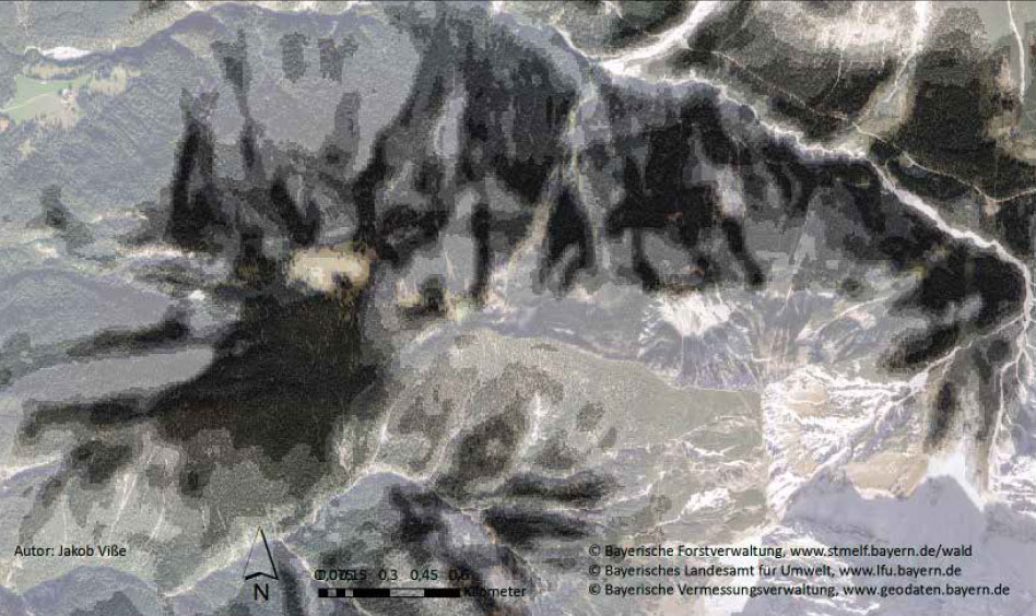 Im Folgenden sollen Empfehlungen für die Anwendbarkeit der Modellierungsergebnisse gegeben werden. Die Karte der relativen Vorkommenswahrscheinlichkeit des Auerhuhns im bayerischen Alpenraum stellt eine wertvolle, auf qualitativ hochwertigen und aktuellen Daten beruhende Grundlage für Beratungshilfen der Forstpraxis dar. Durch ihre Bereitstellung als Rasterdatensatz kann sie in einer gängigen GIS-Software dargestellt und nach individuellen Vorstellungen bearbeitet werden (Abb. 4).