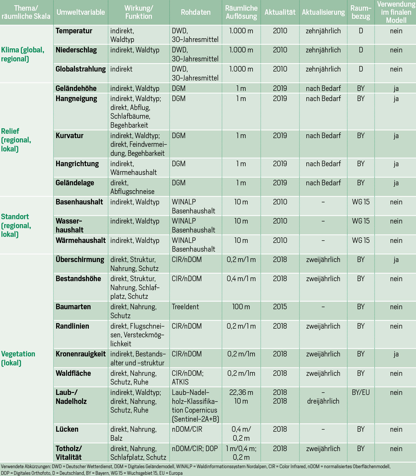 Generell sind für die Modellierung von Artverbreitungen Umweltvariablen mit möglichst direktem Effekt auf die Zielart zu bevorzugen. Da für die großflächige Modellierung die Variablen mit direkter Wirkung nicht für die Gesamtfläche vorliegen (wie beispielsweise Daten zur Krautschicht bzw. des Deckungsgrades von Beersträuchern), ist in der finalen Auswahl die bestmögliche Annäherung über verfügbare Variablen erfolgt. Die finale Auswahl umfasste: Geländehöhe, Exposition, Hangneigung, Geländekrümmung, Kronenüberschirmung und Kronenrauigkeit (siehe Tab. 1).