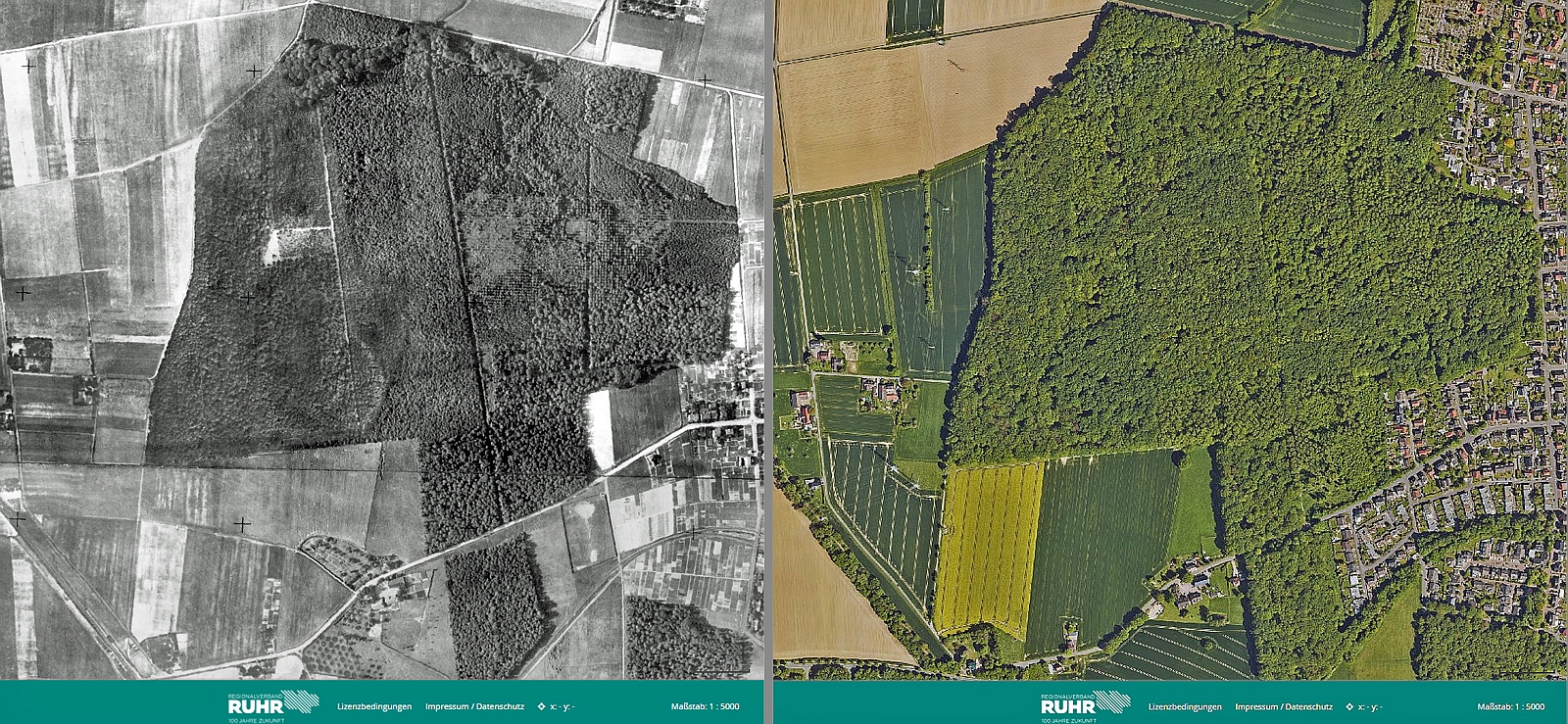- historische Luftbilder und Luftbildpläne der 1920er- bis 1960er-Jahre aus den Beständen des Landesarchivs NRW, des Geoportals Ruhr und der Forstlichen Dokumentationsstelle im Zentrum für Wald und Holzwirtschaft (FoDoS);