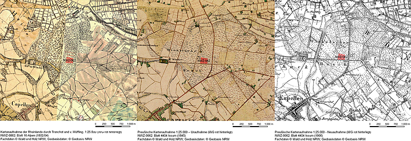 - historische topographische Kartenwerke, wie die Kartenaufnahme der Rheinlande 1:25.000 (Tranchot/v. Müffling), die Preußische Kartenaufnahme 1:25.000 – Uraufnahme (1836-1850), die Karte des Fürstenthums Lippe 1:25.000 (1881-1883) und die Preußische Kartenaufnahme 1:25.000 – Neuaufnahme (1877-1912);