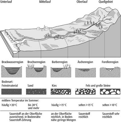 Fließgewässer werden von der Quelle bis zur Mündung in Zonen eingeteilt, die sich durch Temperaturmaxima und Bodenstruktur unterscheiden. Jeder Zone sind so genannte Leitfischarten zugeordnet, die für die jeweiligen Lebensgemeinschaften charakteristisch sind.