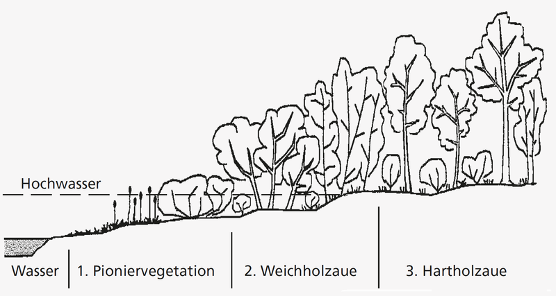 - Die weiter vom Fluss liegenden Bereiche und die höher gelegenen Terrassen werden nur noch sehr selten überschwemmt, bleiben aber dauernd oder zeitweise im Einflussbereich des Grundwassers. Hier entsteht nach Jahren und Jahrzehnten ungestörter Vegetationsentwicklung eine Hartholzaue aus Eschen, Ahorn, Ulmen oder gar Buchen, Eichen und Fichten. Diese Wälder werden von Bäumen mit schwerem, hartem Holz geprägt.