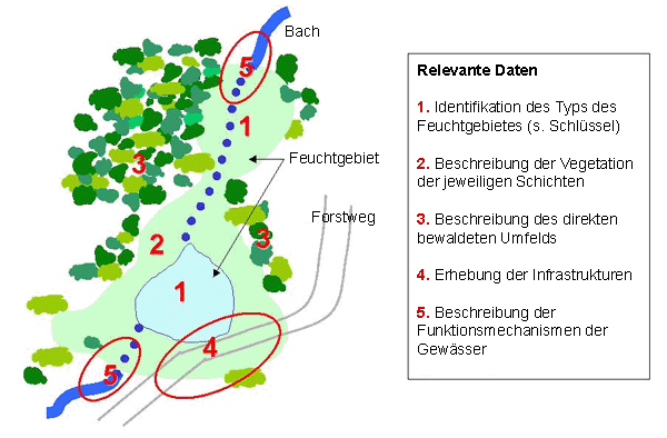 - Strukturelle Beschreibung der Feuchtgebiete (Standort, Oberfläche, Typ, durch die Waldbewirtschaftung hervorgerufene Störungen, Funktion usw.).