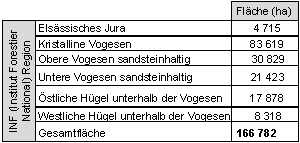 Der Untersuchungsraum erstreckt sich auf eine Fläche von 1666.000 ha und bezieht die öffentlichen elsässischen Wälder des Bergfußes der Vogesen und des elsässischen Jura mit ein. Die geomorphologischen Strukturen sind unterschiedlich, da sechs verschiedene Naturlandschaften vorhanden sind (s. Tab. 1 und Abb. 3).