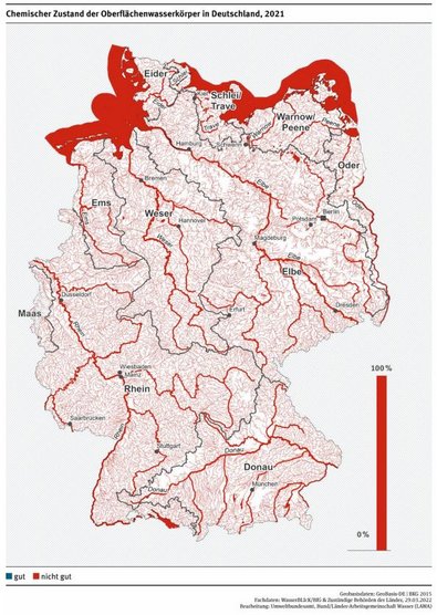 Abb. 4. Der ökologische Zustand (links) und der chemische Zustand (rechts) der Oberflächengewässer in Deutschland [Stand 2022]. Quelle: Umweltbundesamt.