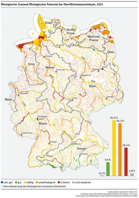 Im Oktober 2022 wurden für Deutschland die Ergebnisse der zweiten Bestandsaufnahme der Gewässer vorgelegt. Sie basierten auf Erhebungen der einzelnen Bundesländer. Es ergab sich folgendes Gesamtbild: Für eine Vielzahl von Gewässern ist nicht zu erwarten, dass sie den guten ökologischen Zustand bis 2027 erreichen (Abb. 4). 91 % aller Oberflächengewässer verfehlen den guten ökologischen Zustand und das gute ökologische Potenzial [3]. Es besteht weiterer Handlungsbedarf.