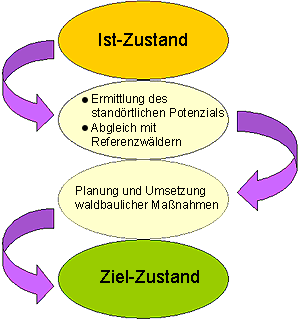 Standortsfremde Wälder können sich am Fliegewässer unter der Voraussetzung von mehrhundertjährigen Zeiträumen wieder aus sich selber heraus zu naturnahen Beständen entwickeln. Um mittelfristig nicht angepasste Waldbestände in stabile, naturnahe bachgebleitende Wälder zu überführen ist es nicht ausreichend, sie der Eigendynamik zu überlassen. Vor Durchführung von Maßnahmen ist zu klären, welches der aktuelle Zustand an den zu behandelnden Fließgewässern ist und wie der Bestand zukünftig aussehen soll bzw. welches das waldbauliche Ziel ist, auf das hin entwickelt werden soll. Hierfür sind einige Zwischenschritte zu beachten (vgl. Abbildung 2). Ohne genaue Kenntnis des Standorts und der dort standortstypischen Waldgesellschaften sollten keine waldbaulichen Maßnahmen erfolgen. Hilfreich ist in jedem Fall der Abgleich mit Referenzwäldern, soweit in der Nähe vorhanden.