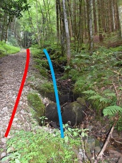 Bei Neuanlage oder -gestaltung des Wegenetzes sollte genügend Abstand zwischen Weg und Fließgewässer eingehalten werden (Abb. 12), damit Platz für die natürliche Gewässerdynamik ist. Bei kleineren Fließgewässern im Wald kann man als groben Anhaltspunkt für die Entfernung den gesetzlich festgelegten Gewässerrandstreifen von 10 m (§ 9 Abs. 1 WG) oder noch besser eine Baumlänge annehmen (etwa 30 m). - Querabschläge an Gräben