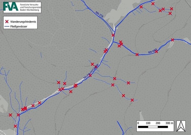 In einer Untersuchung der FVA wurden insgesamt 115 Wanderungshindernisse an Waldbächen in unterschiedlichen Forstrevieren Baden-Württembergs erfasst. Sie kommt zum Ergebnis, dass sich im Durchschnitt 2,7 Querverbauungen pro Kilometer Lauflänge befinden. Beispielhaft ist das Neuhäuserbächle im Schwarzwald (Abb. 5).