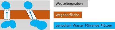 Durch Querabschläge auf Forstwegen (Abb. 13) kann überschüssiges Niederschlagswasser über die Seitengräben in die Waldbestände abgeleitet werden. Dies trägt zum klimawandelangepassten Wasserhaushalt der Wälder bei (Wasserretention). - Sedimentationsräume
