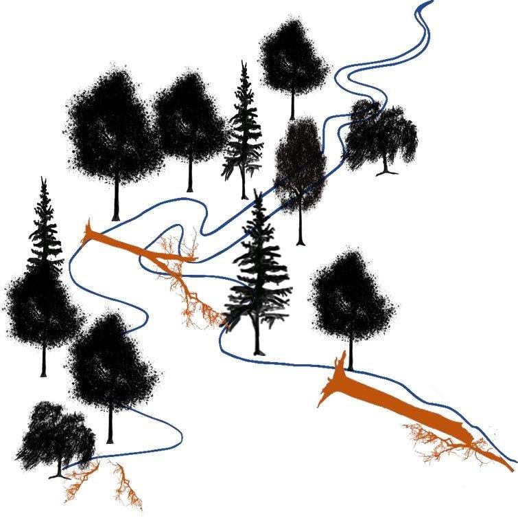 Totholz ist in Fließgewässern in unterschiedlicher Form und Funktion nützlich: Einzelne große Elemente wie umgestürzte Bäume, strömungsparallele Stämme oder Ansammlungen, sogenannte Geniste und Fänger (Abb. 8), dienen als Erosionsschutz am Ufer, als Unterschlupf für Fische und Kleintiere sowie als Keimbett für Pflanzen.