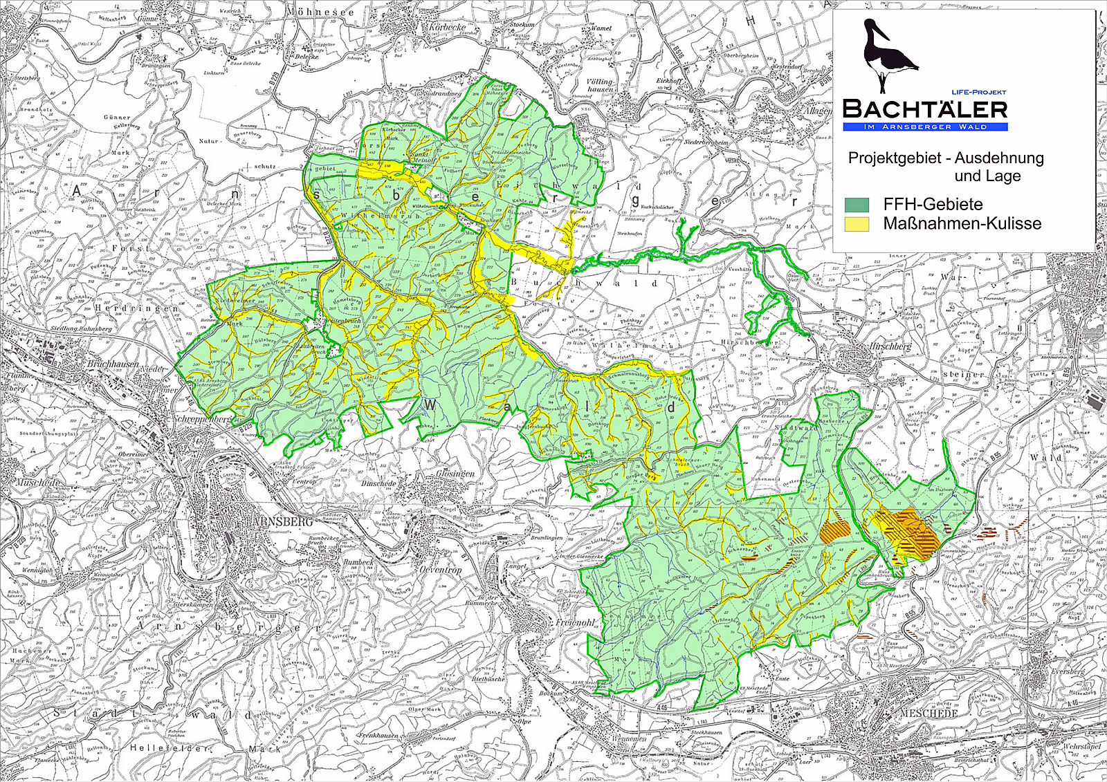 Für das Projekt im Kreis Soest und im Hochsauerlandkreis stehen Mittel in Höhe von insgesamt 1,1 Mio. Euro zur Verfügung, welche zu 50 Prozent von der Europäischen Union und zu 45 Prozent vom Land NRW erbracht werden. Die restlichen fünf Prozent werden von den Projektpartnern finanziert. Das Gebiet umfasst die FFH-Gebiete "Arnsberger Wald", "Heveoberlauf", "Kleine Schmalenau und Hevesee" sowie "Hamorsbruch und Quellbäche". Mit 1.300 Hektar umfasst es große Teile der Bachtäler und Moore der vier FFH-Gebiete, die zusammen eine Fläche von 8.504 Hektar bilden. Maßnahmen des LIFE-Projektes werden ausschließlich auf Flächen in öffentlichem Besitz durchgeführt (Land NRW und Stadt Meschede). Das Projekt läuft vom 2. Januar 2009 bis zum 31. März 2014. Der überwiegende Teil des Projektgebietes wird forstlich genutzt. Rund 97 Prozent der Fläche ist Wald, davon 48 Prozent Laubwald, zwei Prozent Mischwald und 47 Prozent Nadelwald, zumeist Fichte. Etwa ein Prozent der Fläche sind Moor- und Sumpfstandorte. Das Gebiet zeichnet sich durch ausgedehnte Vorkommen von verschiedenen, natürlichen Waldgesellschaften, wie zum Beispiel Hainsimsen-Buchenwäldern oder Erlen-Eschenwäldern, sowie vielen naturnahen Bachabschnitten aus. Ein Schwerpunkt des Projektes sind Maßnahmen, die die natürlichen Lebensräume und Lebensgemeinschaften der Mittelgebirgsbachtäler entwickeln sollen. Innerhalb der Projektkulisse befinden sich Fließgewässer mit einer Gesamtlänge von mehr als 30 Kilometern. Ein Teil der Bäche befindet sich bereits in einem naturnahen Zustand. Andere Gewässer wurden in der Vergangenheit begradigt, ihre Ufer befestigt und ihre Auen durch Entwässerungsgräben trocken gelegt. Die Auen wurden in erheblichem Umfang mit Fichten aufgeforstet, die die Gewässer ausdunkeln und die Lebensraumqualität einschränken. Ziel der wasser- und waldbaulichen Maßnahmen im Rahmen des LIFE-Projektes ist eine Strukturanreicherung in den Gewässern sowie die Wiederherstellung einer naturnahen Fließgewässerdynamik und der Bach begleitenden Auen auf einer Fläche von rund 150 Hektar. |