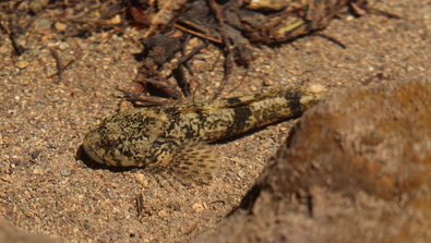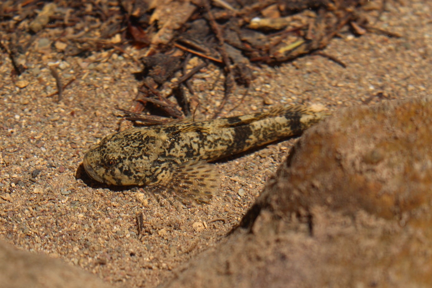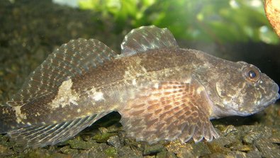 Abb. 4. u. 5. Die Groppe (Cottus gobio) ist am Bachgrund durch ihre Färbung gut getarnt. Schwellen stellen für sie unüberwindbare Hindernisse dar. Fotos: Lisa Gollent (4), Piet Spaans (5), CottusGobioSpreadingFins (CC BY-SA 2.5)