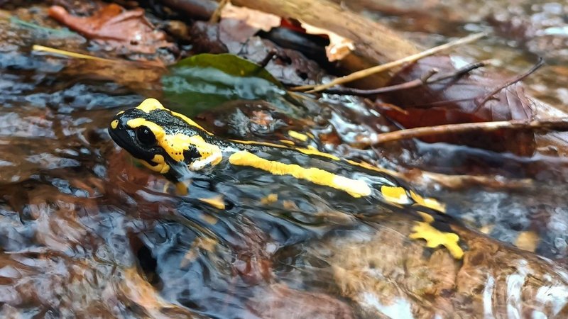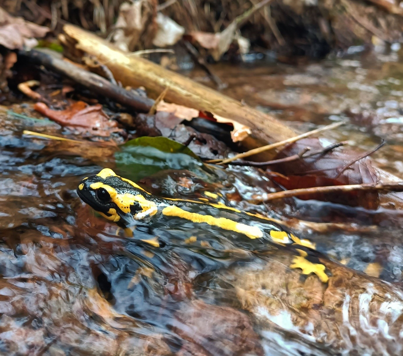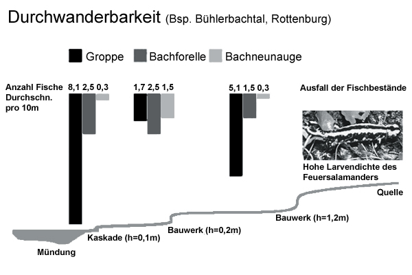 Auch der seltene Feuersalamander (Salamandra salamandra) verbringt einen Teil seines Lebens in Gewässern. Einmal im Jahr zwischen April und Juli gebären die befruchteten Weibchen die Larven in meist kühlen Quellbächen. Als Larven leben die Feuersalamander in sauberen, kühlen Gewässern. Den Großteil ihres Lebens verbringen sie aber an Land in angrenzenden strukturreichen und feuchten Mischwäldern. Feuersalamander können in einzelnen Fällen von Querverbauungen in Bachoberläufen profitieren. Abschnitte, die für Forellen und Groppen unzugänglich sind, zeigen bisweilen außergewöhnlich hohe Dichten von Larven des Feuersalamanders.