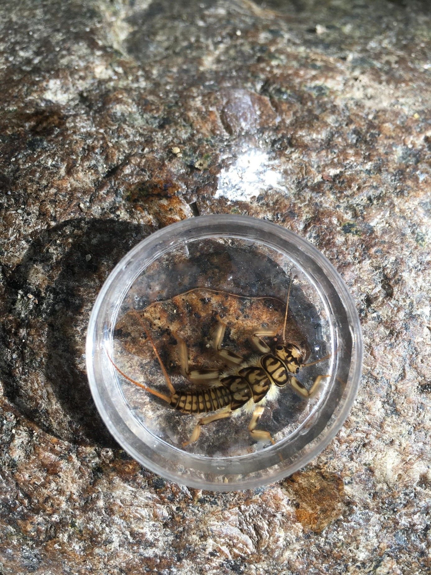 Die meisten Organismen im Bach sind erst zu erkennen, wenn man unter die Steine des Bachbetts blickt. Zahlreiche wirbellose Kleinlebewesen, das sogenannte Makrozoobenthos, leben im vom Wasser durchströmten Lückensystem der Bachsohle, das sogenannte Interstitial. Darunter sind viele wassergebundene Insekten (z. B. Libellen, Steinfliegen, Eintagsfliegen, Köcherfliegen u. a.). Sie verbringen hier im geschützten Lückensystem ihr Larvenstadium, das meist viel länger dauert als das Adultstadium. Eintagsfliegen verbringen zum Beispiel mehrere Monate bis Jahre als Larven. Als Adulttier sterben sie meist nach 1-4 Tagen. Viele dieser Insektenlarven sind wichtige Zeigerorganismen für eine gute Wasserqualität (z. B. Steinfliegenlarven, Abbildung 8). Neben den Insektenlarven gehören unter anderem Bachflohkrebse, Ringelwürmer, Plattwürmer und Schwimmkäfer zum Makrozoobenthos der Waldbäche.