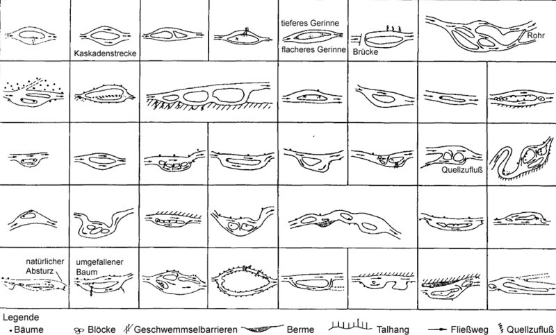 Naturnahe Mittelgebirgsbäche besitzen ausgesprochen ungleichförmige Querprofile, die in Abhängigkeit von der Sohlengliederung, der Geschiebeführung, der Laufform und der Ufervegetation sehr stark in ihrer Breite und Tiefe variieren.