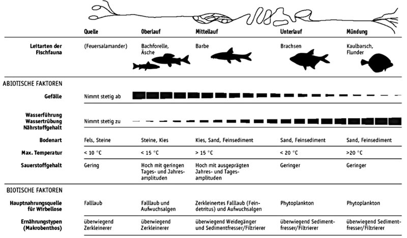 Der längszonale Wandel eines Gewässerlaufes betrifft nicht nur die physiografischen Faktoren wie Gefälle, Strömung, Geschiebeführung oder Laufform, sondern er prägt und verändert gleichermaßen sämtliche Lebensgemeinschaften des Gewässers.