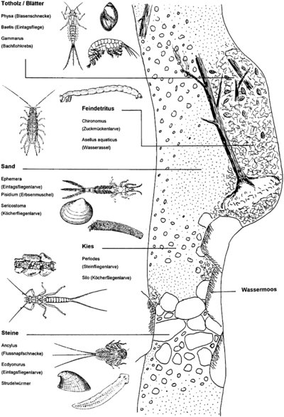 Trotz ihrer in vieler Hinsicht extremen Lebensbedingungen stellen die Bergbäche außergewöhnlich artenreiche Lebensräume dar. Der Schlüssel für diese Vielfalt ist ihr großer Strukturreichtum, der biologisch betrachtet entscheidend ist für Anzahl und Mosaik der besiedelbaren Kleinlebensräume oder Habitate. Viele Arten besitzen aufgrund ihrer Ernährungsweise und anderer Anpassungen an den Lebensraum "Bergbach" spezifische Bindungen an bestimmte Habitattypen. Die Abb. 12 zeigt den Ausschnitt eines Bergbaches mit seinem typischen Mosaik der Substrate bzw. Habitate und deren jeweiligen spezifischen Bewohnern in beispielhafter Auswahl.
