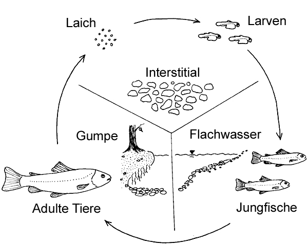Ein wesentlicher Lebensraum der Mittelgebirgsbäche bleibt unseren Augen weitgehend verborgen und ist dennoch von elementarer Bedeutung. Er umfasst den aus Geschiebe bestehenden, lückenreichen und vom Wasser des Baches stetig durchströmten Schotter- oder Kieskörper unter der Bachsohle – das Interstitial. Aufgrund der ausgeglichenen Temperatur- und Strömungsverhältnisse herrschen hier viel günstigere Lebensbedingungen als im fließenden Wasserkörper. Die Bachsohle und das darunter liegende Interstitial stellen daher die am dichtesten besiedelten Lebensräume im Bergbach dar. Eine große Zahl von Tierarten der Fließgewässerfauna verbringt ihre empfindlichen Jugendstadien im verborgenen Lückensystem unter der Bachsohle. Beispiele sind Bachforelle, Äsche und andere Kieslaicher (siehe Abb. 11).