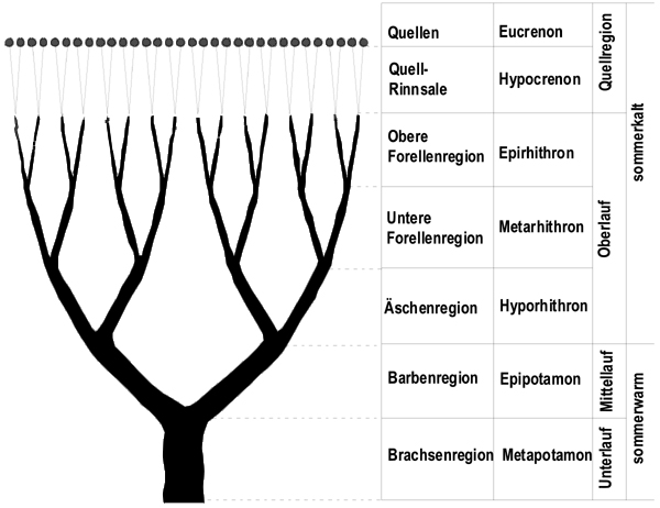 Die Gewässerorganismen haben sich im Laufe ihrer Entwicklungsgeschichte an die spezifischen Lebensbedingungen der sehr unterschiedlichen Fließgewässerzonen angepasst und sozusagen "gelernt", dort zu existieren. So haben sich von der Quelle bis zur Mündung sehr unterschiedliche Gewässerlebensgemeinschaften herausgebildet, die einander im Längsverlauf kontinuierlich ablösen. Diese Veränderungen sind so charakteristisch, dass sich ein natürliches Fließgewässer in verschiedene biozönotische Zonen oder Flussregionen gliedern lässt. Am bekanntesten ist eine Einteilung aufgrund der Leitarten der Fischfauna.