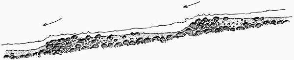 Verringert sich das Gefälle, geht das kaskadenartige Fließen allmählich in eine Abfolge von Rauschen und Stillen über (siehe Abb. 8). In den "Rauschen" fließt das Wasser schnell und flach über grobes Sohlmaterial; in den "Stillen" strömt es dagegen meist tief und langsam dahin.