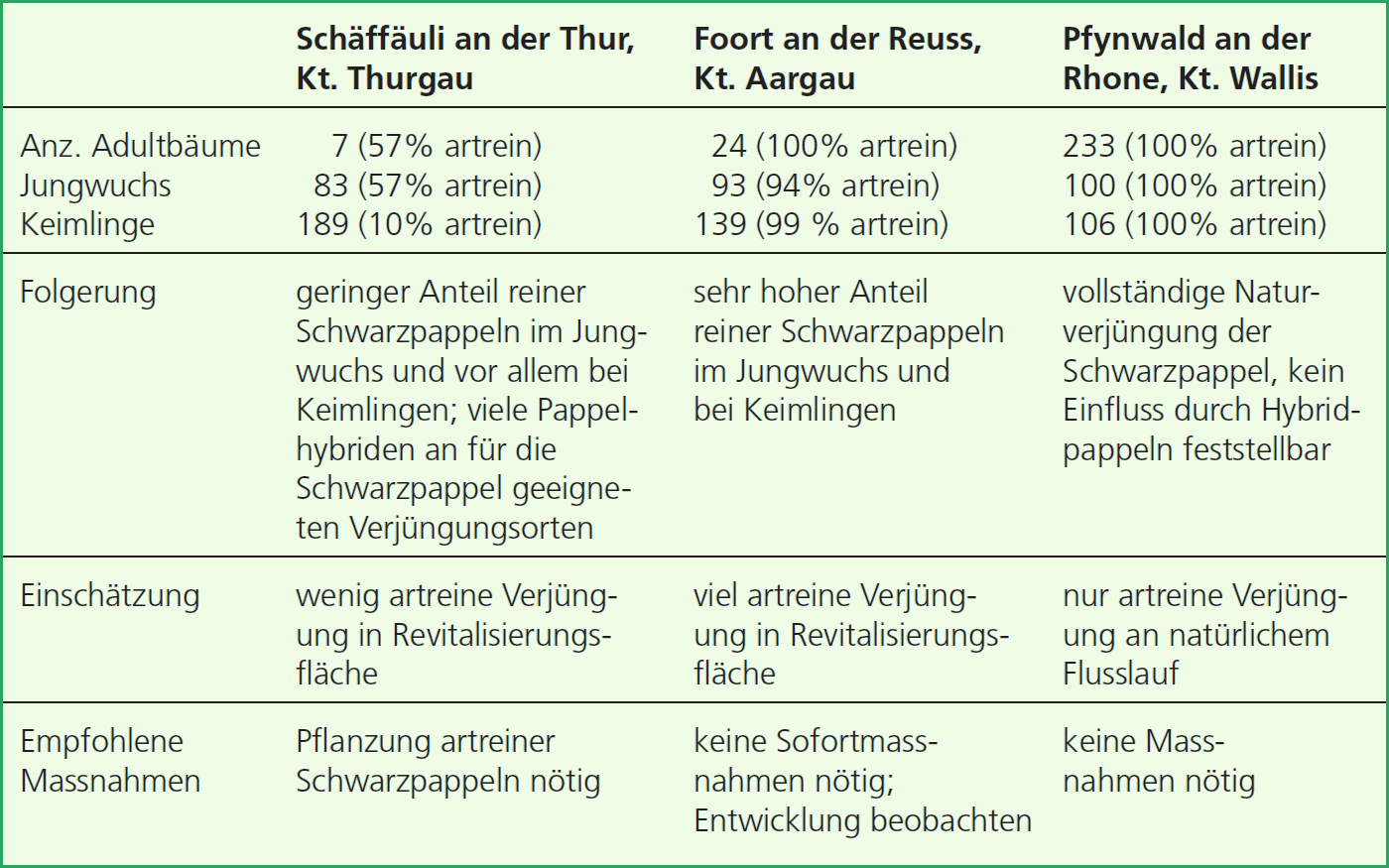 Im Pfynwald an der Rhone wachsen sehr viele adulte artreine Schwarzpappeln und sämtliche untersuchten Keimlinge oder Jungbäumchen waren artrein, obwohl in der Umgebung viele Hybridpappeln vorkommen. Die Naturverjüngung der Schwarzpappel in diesem Gebiet ist somit ohne weitere Massnahmen sichergestellt.