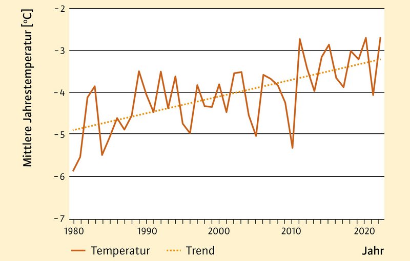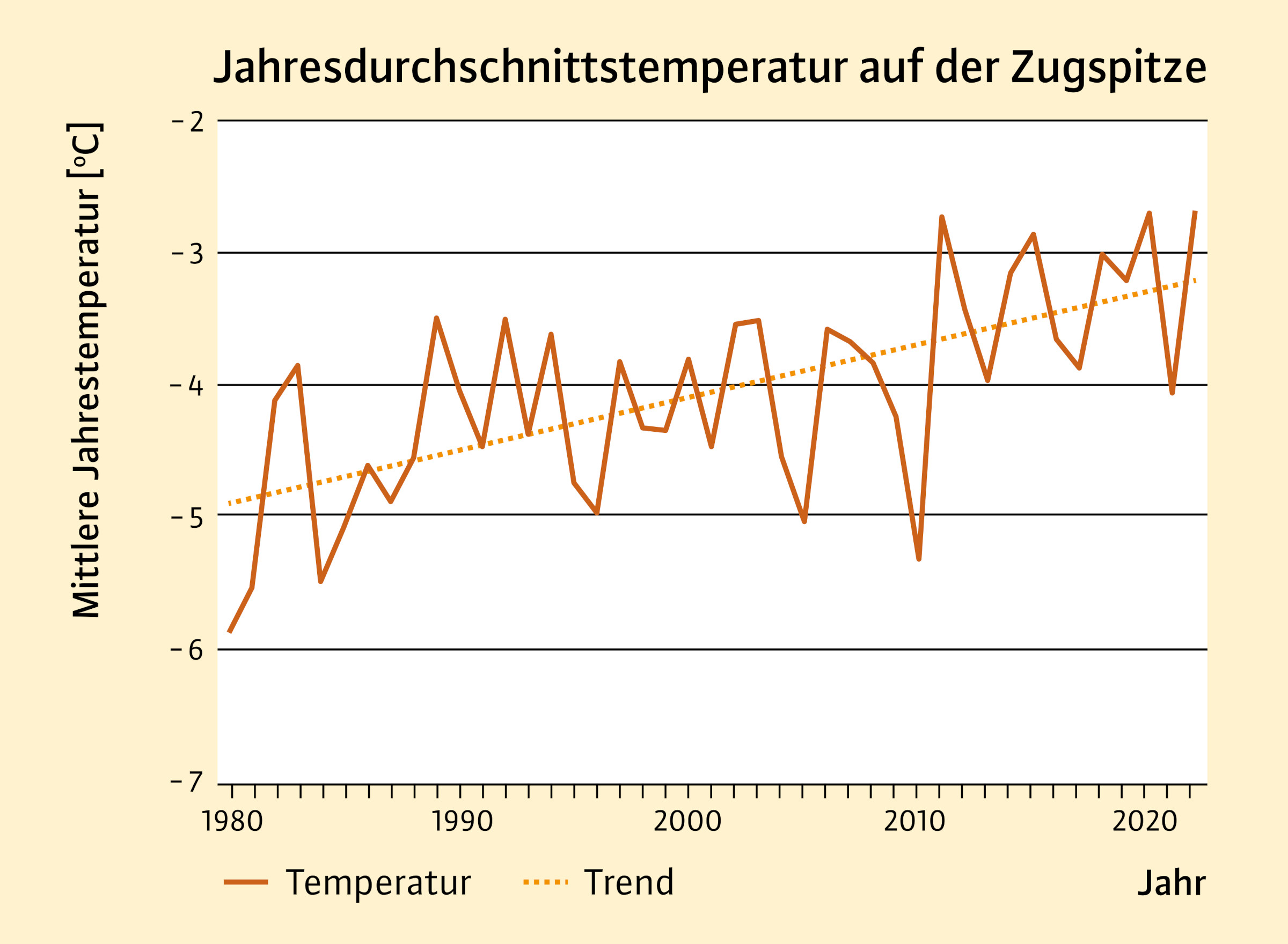 Dass das Untersuchungsgebiet von den Auswirkungen des Klimawandels bereits stark betroffen ist, wird augenscheinlich, wenn man die Temperaturentwicklung auf der nahegelegenen Zugspitze betrachtet. Dort wurde seit den 1980er Jahren ein deutlicher Anstieg der Jahresmitteltemperatur um fast zwei Grad gemessen (Abbildung 2). Auch die Prognosen für die kommenden 50 Jahre sagen für die Alpen eine doppelt so hohe Erwärmung wie für das angrenzende Tiefland voraus, weshalb mit massiven Auswirkungen auf die Ökosysteme und Lebensgemeinschaften der Bergwälder zu rechnen ist. Das Naturwaldreservat Wettersteinwald mit seinen historischen floristischen und faunistischen Dokumentationen stellt insofern ein gut geeignetes Untersuchungsobjekt dar, um die Folgen des Klimawandels für unsere Hochlagenwälder beobachten und analysieren zu können.