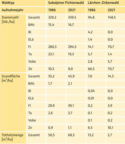 Etwas anders stellt sich die Situation im Lärchen-Zirbenwald dar. Hier stieg die Gesamt-Stammzahl von durchschnittlich 95 auf 149 Stück/ha deutlich an, wobei dieser Anstieg vor allem in der signifikanten Stammzahlzunahme der Fichte begründet liegt. Während in den Altaufnahmen im Mittel nur ca. 14 Fichten je Hektar vorkamen, sind es heute über 70 Individuen je Hektar. Ungefähr die Hälfte aller aktuell erfassten Fichten-Individuen weist dabei noch einen Brusthöhendurchmesser von weniger als 20 Zentimetern auf. Einwüchse in den Derbholzbestand spielten hier also eine deutlich größere Rolle als in den subalpinen Fichtenwäldern.