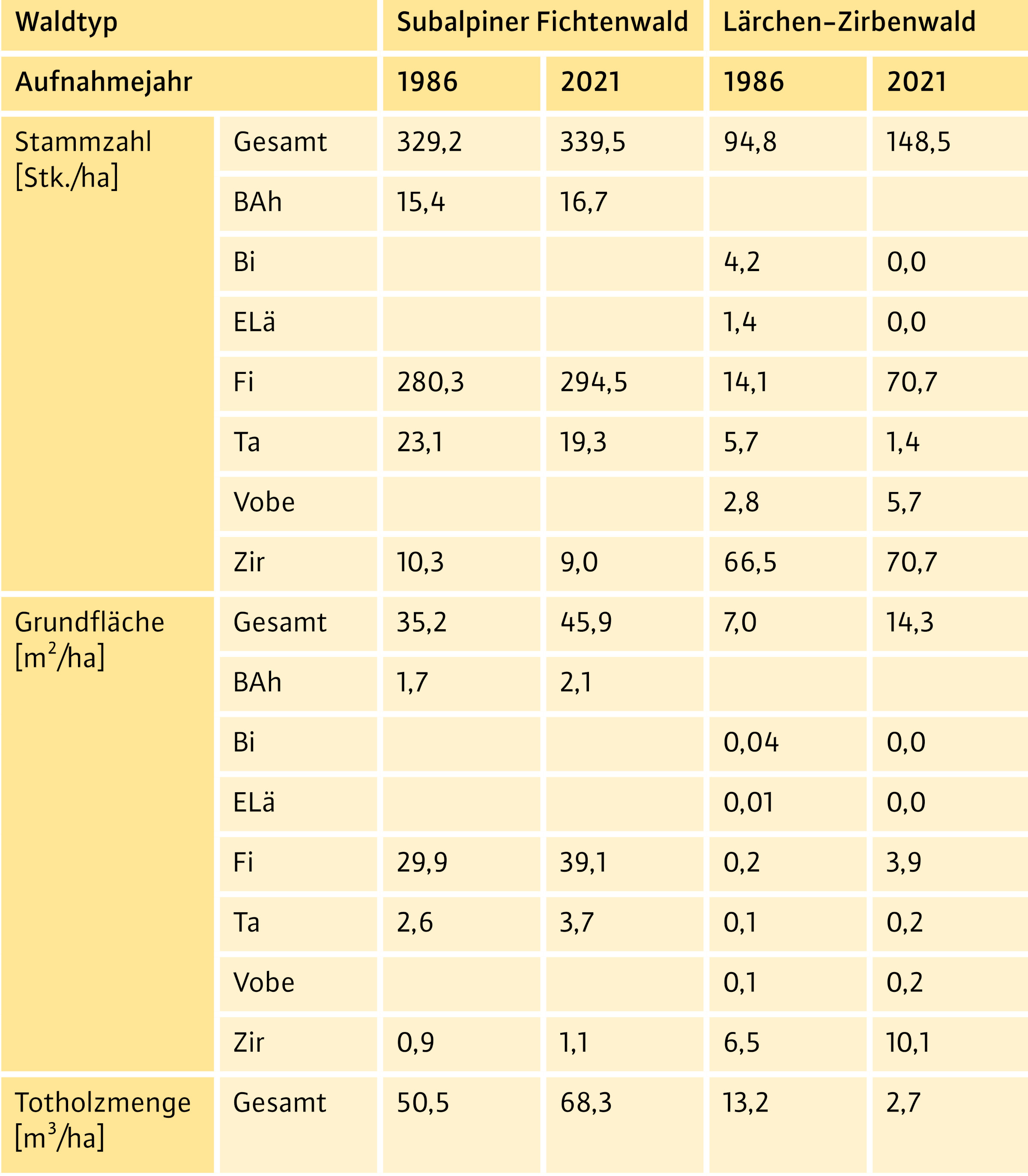 Bezüglich der Stammzahlen waren im subalpinen Fichtenwald kaum Änderungen im Vergleichszeitraum zu erkennen. Dies gilt sowohl für die Gesamtstammzahl (durchschnittlich 329 Stück/ha in den Altaufnahmen vs. 340 Stück/ha in den Wiederholungsaufnahmen) als auch für die Stammzahl der einzelnen Baumarten (Abbildung 3). Neue Einwüchse in den Derbholzbereich hielten sich mit den Abgängen aus dem Altbestand weitestgehend die Waage.