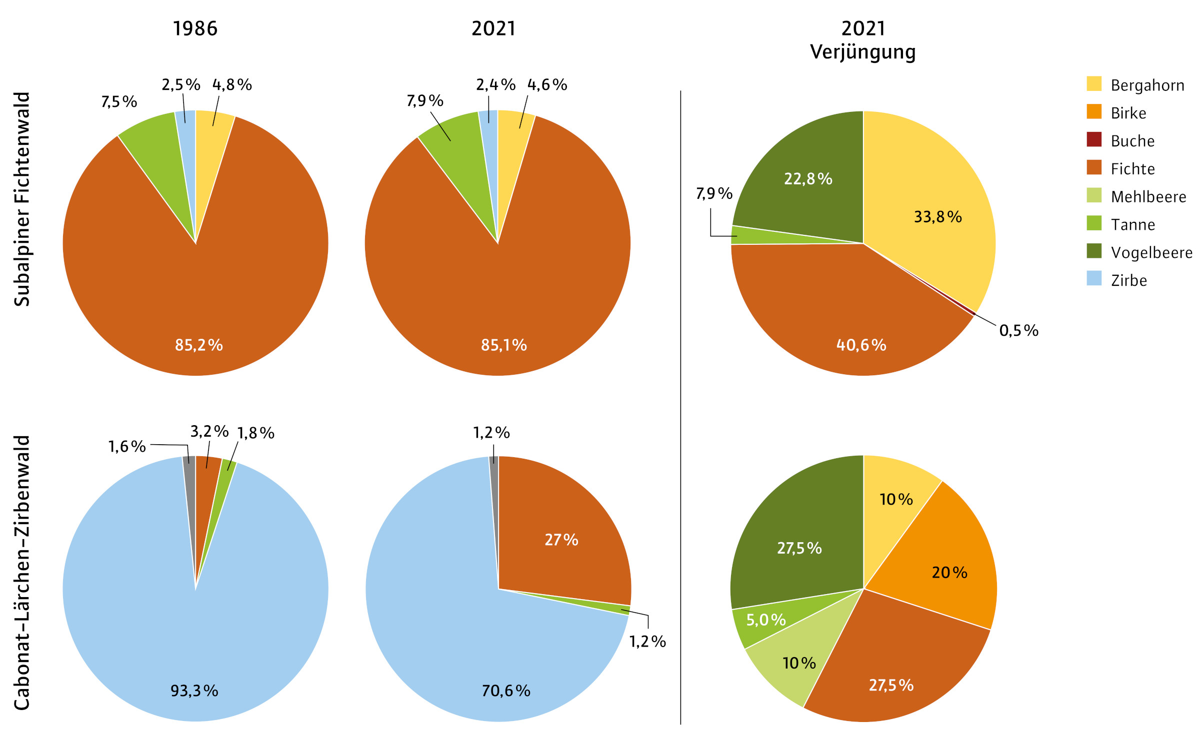 Durch die zunehmende Etablierung der Fichte (oder anderer schattenspendender Baumarten wie Bergahorn) in den lichten und offenen Hochlagenbeständen dürfte die natürliche Verjüngung der Zirbe künftig allerdings eher erschwert werden, da sich deren Jungwuchs durch ein vergleichsweise hohes Lichtbedürfnis auszeichnet. Je ungünstiger die Belichtungsbedingungen für die jungen Zirben werden, umso mehr werden sie im zwischenartlichen Wettbewerb schattentoleranteren Baumarten wie der Fichte unterliegen. Eine Sukzession hin zu eher fichtendominierten Beständen könnte dadurch weiter verstärkt werden. Dass die Bedingungen für eine natürliche Verjüngung der Zirbelkiefer aktuell offensichtlich bereits ungünstig sind, zeigt die Baumartenzusammensetzung innerhalb der Verjüngungsschicht. Dort konnte im Lärchen-Zirbenwald im Jahr 2021 keine einzige Zirbe nachgewiesen werden, während der Anteil der Fichte bei fast 30 % lag (Abbildung 4 unten).