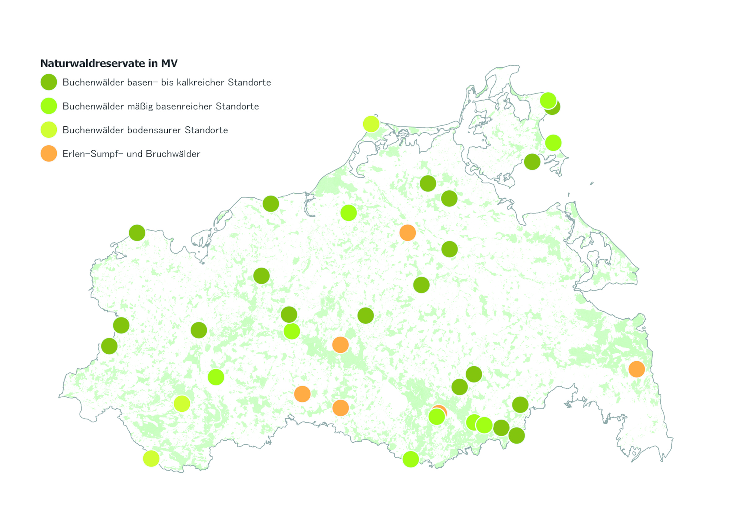 Im Rahmen des Naturwald-Programms werden in Mecklenburg-Vorpommern aktuell 37 Naturwaldreservate (NWR) mit einer Gesamtfläche von 1.645 Hektar wissenschaftlich untersucht. Zuzüglich der sogenannten Waldmonitoring-Flächen in den drei Nationalparken liegt mit insgesamt über 2.000 Hektar in mehr als 50 langzeitbeobachteten Naturwald-Flächen ein umfangreicher Pool für die Dauerbeobachtung weitestgehend ungestörter Prozesse der Waldentwicklung im nordöstlichsten Bundesland vor.