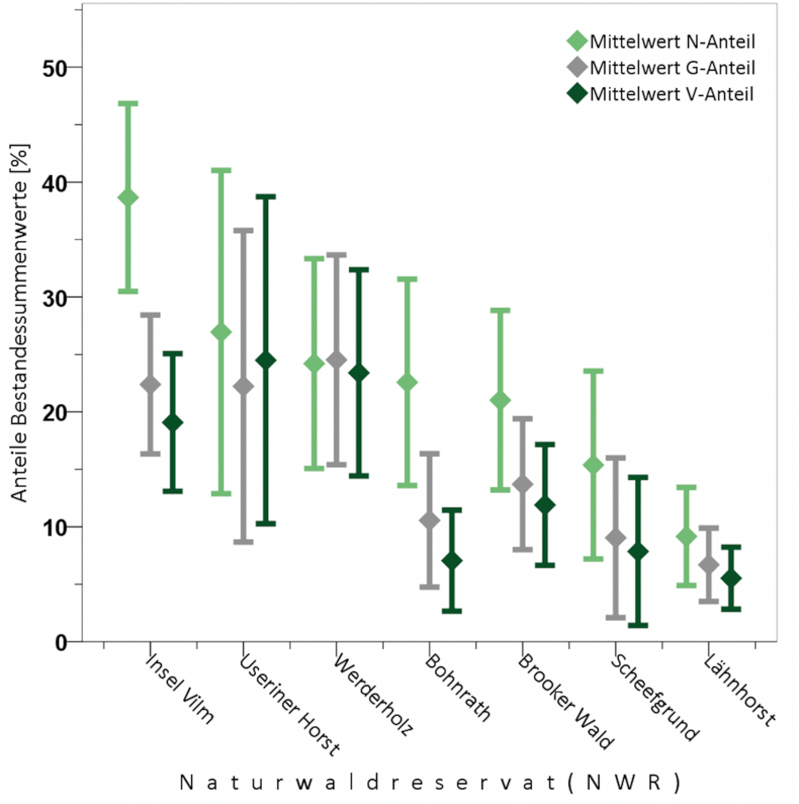Der Status der konkurrenzstarken Baumart innerhalb der Waldbestände der untersuchten NWR stellte sich recht unterschiedlich dar. In den meisten Gebieten trat Ahorn mit hoher Stetigkeit in einer stammzahlreichen Gertenholzschicht auf. In vielen NWR hatte sich die Art auch in Stangen- und schwachen Baumhölzern etabliert und bildete dort z. T. eine den Zwischenstand dominierende Baumschicht. Einzelne NWR wiesen bei ihrer Erstaufnahme Bestandespartien mit reinem Berg-Ahorn im mittleren und starken Baumholz auf, die auf Flächen zwischen ein und zwei Hektar den Oberstand einnahmen. Reife Buchen-Altholzbestände mit einem höheren Mischungsanteil stärkerer Ahorne wurden selten vorgefunden. Insbesondere in den NWR der PNV-Gruppe der Buchenwälder basen- bis kalkreicher Standorte erreichte Berg-Ahorn z. T. nicht unwesentliche Anteil an der Bestandesdichte. Hier wurden in einzelnen Gebieten Grundflächen- und Vorratsanteile zwischen 20 und 30 Prozent ermittelt (s. Abb. 2), wenngleich in der größeren Anzahl dieser Reservate der Vorratsanteil eher um die 10 %-Marke schwankte. Dass sich für die Stammzahl-Anteile in allen NWR grundsätzlich die höchsten Zahlenwerte unter den betrachteten Dichtemaßen ermitteln ließen (s. Abb. 2), wurde als Indiz für die weitere Etablierung der Baumart in den Buchen-NWR Mecklenburg-Vorpommerns gewertet.