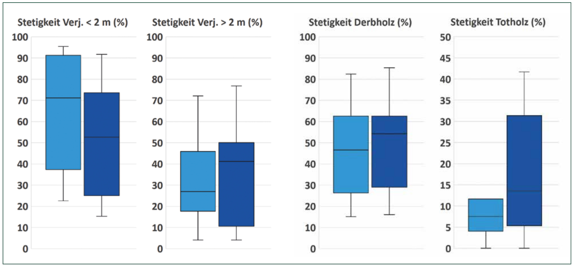 Hier ist zu erkennen, dass das Auftreten des Berg-Ahorns in der Verjüngungsschicht unter zwei Meter Höhe tatsächlich abgenommen hat. In allen übrigen Straten, so der Verjüngung über zwei Meter Höhe, dem Derbholzbestand sowie dem vorgefundenen Totholz sind die Stetigkeitswerte des Ahorns leicht gestiegen.