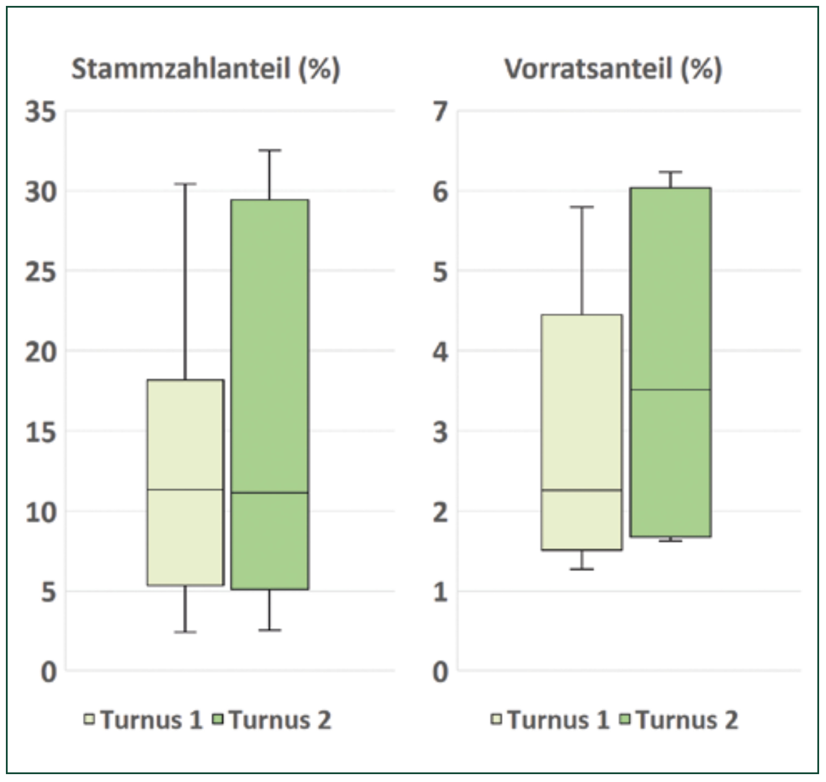 Aus der festgestellten Zunahme der Stetigkeit sowie auch der absoluten Werte für Stammzahl, Grundfläche und Vorrat für die Baumart Berg-Ahorn ergab sich die Frage, ob aus diesen Befunden eine Veränderung der Baumartenzusammensetzung resultieren könnte. Wesentliche Einflussgröße war hier schließlich der Umfang der in allen Buchen-NWR für die 10 Jahre erfolgte generelle, von der Rotbuche dominierte Vorratsaufbau. In Abb. 5 sind die Verteilungen der Werte für den Stammzahl- sowie den Vorratsanteil des Ahorns in den 9 untersuchten NWR abgebildet. Man erkennt für beide Anteilswerte grundsätzlich eine Zunahme. So steigt das arithmetische Mittel des Stammzahlanteils von 12 auf 15 Prozent. Wie jedoch die Verteilung der Werte bereits vermuten lässt, ließ sich diese Erhöhung nicht statistisch sichern. Dem entgegen war der leichte Anstieg des Vorratsanteils von Turnus 1 zu Turnus 2 für den Berg-Ahorn signifikant.