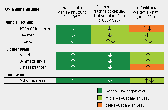 Die Biodiversität im Wald hat sich verändert: vor der industriellen Revolution nutzte der Mensch die Wälder mehrfach (z.B. Holz- und Streunutzung, Waldweide). Dies führte zu strukturreichen, lichten Flächen. Mit zunehmender Industrialisierung setzte die intensive Holznutzung mit Kahlschlägen ein. Grossflächig wurden ertragsreiche Baumarten gepflanzt, was zu gleichaltrigen Beständen, Licht- und Strukturarmut und damit zum Rückgang der Artenvielfalt geführt hat. Auch Totholz wurde seit Jahrzehnten zum Heizen und Kochen genutzt. Ein Rückgang der holzzersetzenden Pilze und anderer von totem Holz abhängiger Arten war die Folge.