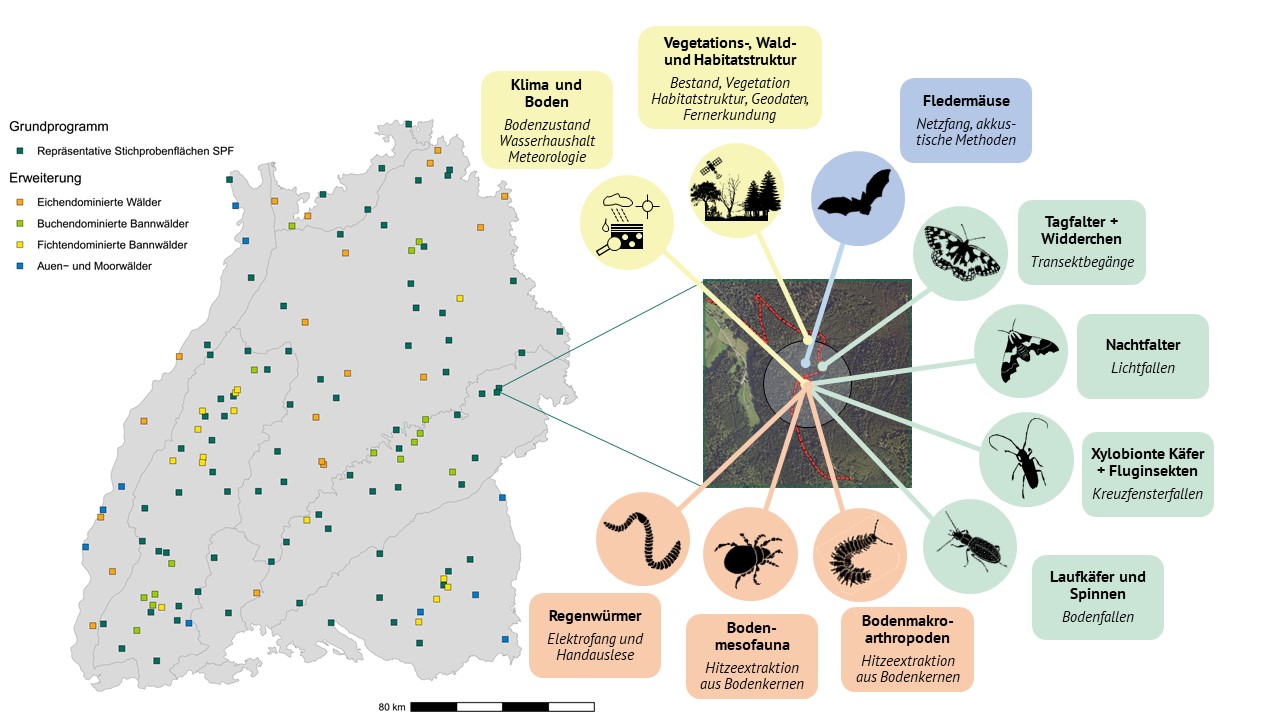 Das Biodiversitätsmonitoring der FVA erfasst auf rund 80 repräsentativen Waldflächen und rund 50 Erweiterungsflächen für spezifische Fragestellungen Bodenlebewesen, Insekten, Fledermäuse sowie die sie beeinflussenden Standorteigenschaften und Waldstrukturen. Zusätzlich werden Umweltdaten mittels etablierter Methoden des Boden- und Umweltmonitorings erhoben. Durch innovative Fernerkundungsmethoden wie dem mobilen Laserscanning oder Luftbildauswertungen werden sowohl flächendeckend als auch kleinräumig verschiedene Waldstrukturen erfasst. So können Zustand und Entwicklung der Biodiversität sowie deren Abhängigkeit von der Waldbewirtschaftung beschrieben werden. Das Monitoring der Waldbiodiversität ist eine Daueraufgabe und Basis für ein adaptives Waldmanagement. Gleichzeitig werden so Grundlagen für Forschung und Entwicklung sowie für politische Entscheidungen und deren Evaluierung und Kommunikation geschaffen.