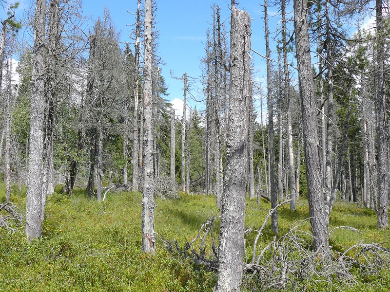 Ungewiss ist die Entwicklung der Bergföhre, die nach der Fichte die zweithäufigste Baumart im Rorwald war. Auf vielen Moorflächen bildete sie Reinbestände. Sturm und Buchdrucker haben die Bergföhren besonders stark dezimiert (Abb. 6). Werden sich diese Flächen, auf denen zum Teil kein lebender Baum mehr steht, wieder mit Bergföhren bestocken? Dies wäre zu erwarten, weil sich diese Baumart in Hochmooren gegenüber der Fichte normalerweise auf Dauer durchsetzen kann (Schmid et al. 1995). Bis heute (Stand 2009) zählten wir jedoch erst sehr wenige junge Föhren. Gründe für die spärliche Bergföhrenverjüngung könnten Samenmangel infolge fehlender Mastjahre oder die dichte Bodenvegetation mit zu wenig offenem Boden sein. Abgesehen davon ist es naheliegend, dass es auf moorigen, höher gelegenen Flächen einfach sehr lange dauert, bis sich ein neuer Waldbestand entwickelt.