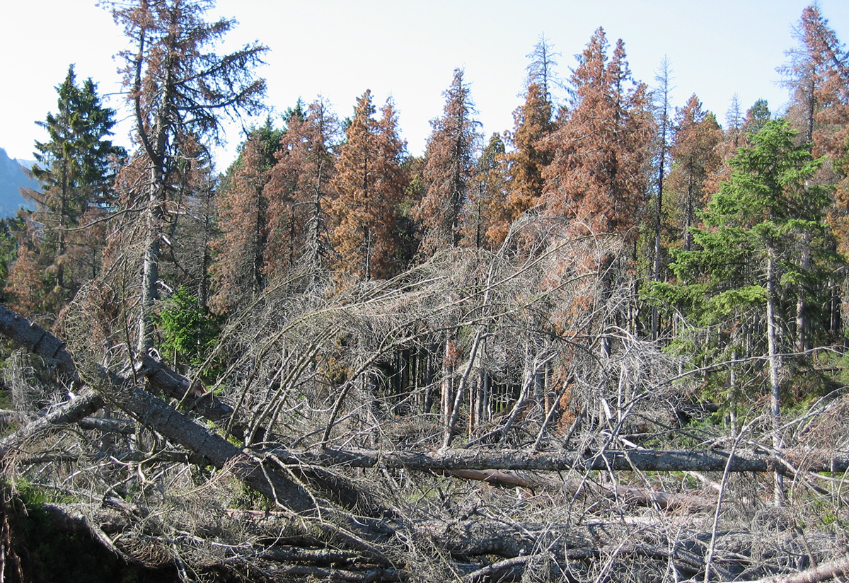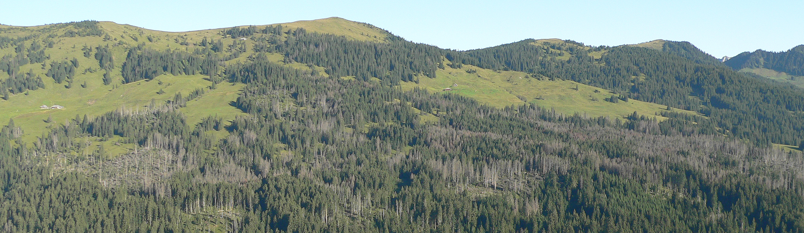 Nach Stürmen steigt das Risiko für Borkenkäferbefall an. Weil "Lothar" im Rorwald hunderte Fichten auf grosser Fläche geworfen hat und das Fallholz liegen blieb, konnte sich der Buchdrucker in den ersten Jahren nach dem Sturm besonders stark vermehren. Innert kurzer Zeit verfärbten sich ganze Bestände rotbraun (Abb. 2). Besonders auffällig war, dass die Borkenkäfer auch die Bergföhren stark befielen und diese gegenüber den Fichten sogar bevorzugten. Weil der Absterbeprozess grossflächig verlief, war damit zu rechnen, dass bald kaum ein dicker lebender Baum mehr übrig bleiben würde.