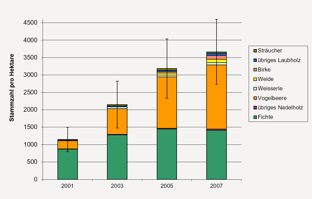 Im Zentrum des Forschungsprojekts steht die Waldverjüngung; das sind Bäumchen zwischen 20 cm und 300 cm Höhe. Im Rorwald verjüngen sich hauptsächlich Fichten und Vogelbeeren. Während die Zahl der Fichten zwischen 2001 und 2007 um über 50% auf 1410 Bäumchen pro Hektare angestiegen ist, hat die Vogelbeere noch stärker zugenommen: von 236 auf 1846 Bäumchen pro Hektare (Abb. 5). Besonders die grossen Windwurfflächen boten dieser Baumart gute Keimungsbedingungen und genügend Licht. Bei der Fichte handelt es sich zu einem grossen Teil um Vorverjüngung, die sich nach der durch "Lothar" verursachten Auflichtung ausgezeichnet entwickelt. In den letzten Jahren zählten wir auch immer mehr Moorbirken und Weichgehölze wie Weiden- und Pappelarten sowie Weisserle. Ausser Bergahorn und Weisserle wachsen praktisch alle Laubhölzer auf den Windwurfflächen, wo sich bis heute (Stand 2009) eine beachtliche Baumartenvielfalt entwickelt hat.