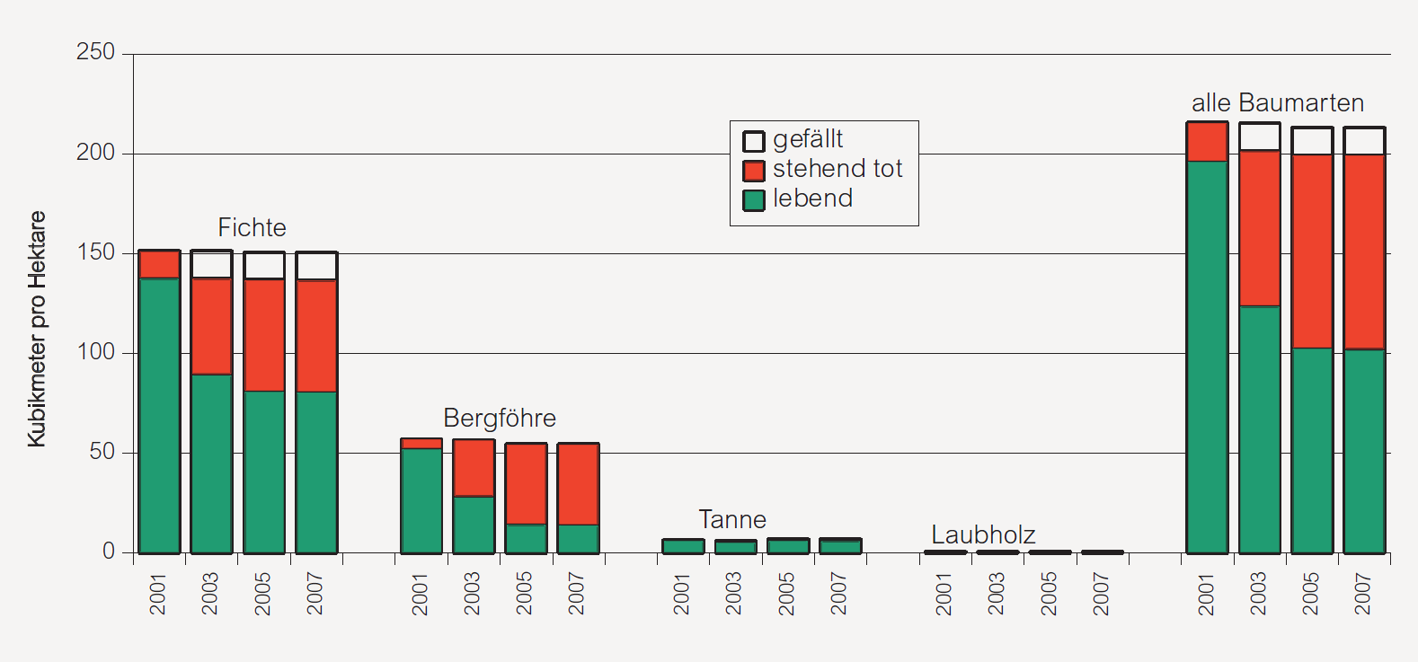 Im Rahmen der Erhebungen hielten wir unter anderem fest, ob ein stehender Baum lebend oder tot ist (Abb. 4). Die meisten Bäume, die von "Lothar" verschont geblieben waren, lebten im Jahr 2001 noch. Das stehende Totholz bestand 2001 lediglich zu 30% aus Bäumen, die nach "Lothar" abstarben. 70% wurden entweder durch den Orkan "Lothar" abgebrochen oder waren bereits vor dem Sturm tot. Dies änderte sich in den darauf folgenden Jahren wesentlich, denn die seit "Lothar" abgestorbenen Bäume fielen in praktisch allen Fällen dem Borkenkäfer zum Opfer.