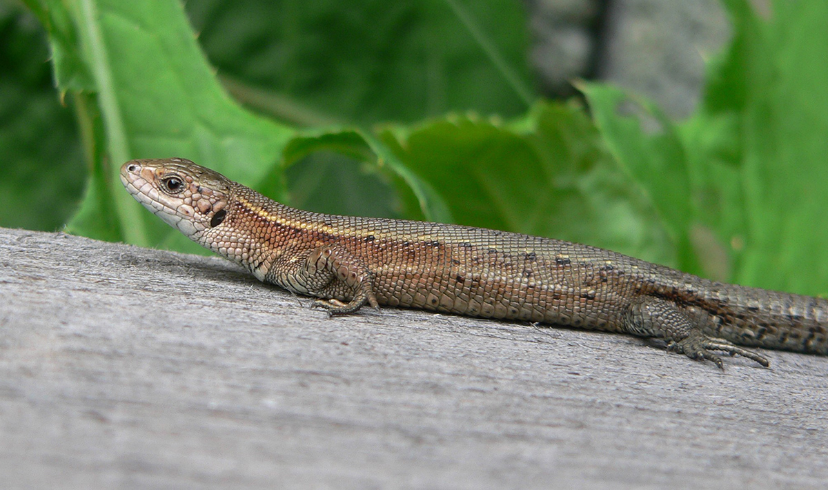 Abb. 7 - Die Waldeidechse hat vom Sturm pofitiert. Auf den lichtdurchfluteten Windwurfflächen erwärmt sich das tote Holz schnell. Sturmflächen locken auch Insekten an, von denen sich das kleine Reptil ernährt. Foto: Thomas Reich (WSL)
