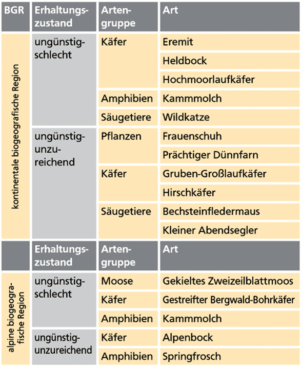 Ziel der FFH-Richtlinie ist, Lebensräume wie Tier- und Pflanzenarten in einem günstigen Erhaltungszustand zu bewahren bzw. diesen wiederherzustellen. Demzufolge besteht für gelb und vor allem rot bewertete Schutzgüter ein erhöhter Handlungsbedarf (Tab. 2). Auch grün bewertete Arten sollten dabei nicht vollständig aus dem Fokus geraten, um ein Absinken auf einen ungünstigen Erhaltungszustand zu vermeiden. Unterschiedliche Arten können als Zielarten für Artenschutzmaßnahmen im Wald dienen.