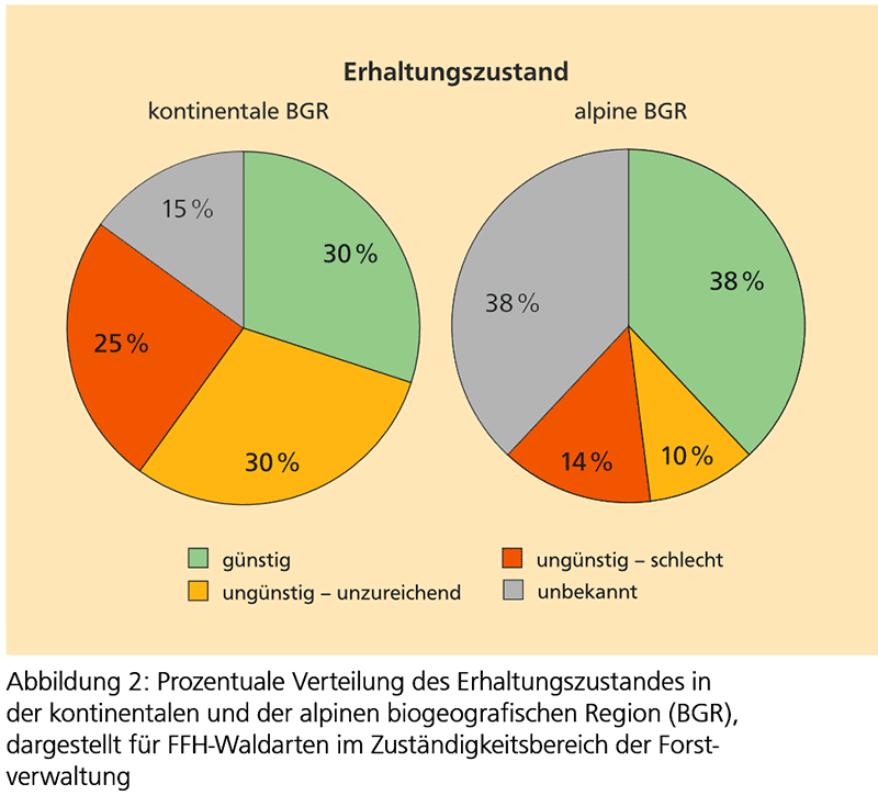 In Bayern befindet sich die Mehrheit der Waldarten in der kontinentalen BGR in einem ungünstigen Erhaltungszustand (gelb und rot); knapp ein Drittel der bewerteten Arten haben einen günstigen Erhaltungszustand (grün). Für 15 Prozent der Arten konnte aufgrund unzureichender Datengrundlagen keine Aussage (grau) getroffen werden (Abb. 2, links). In der alpinen BGR dagegen übersteigt der Anteil der Arten mit günstigem Erhaltungszustand deutlich den Anteil der rot und gelb bewerteten Schutzgüter. Auffallend hoch ist hier jedoch mit 38 Prozent der Anteil unbekannter Arten (Abb. 2, rechts). Demnach finden wir in den Bayerischen Alpen für FFH-Waldarten günstigere Lebensbedingungen vor als im Hügelland und Mittelgebirge. Auch wegen der als "unbekannt" bewerteten Arten müssen die Datengrundlagen stetig verbessert und erweitert werden, vor allem in den Alpen.