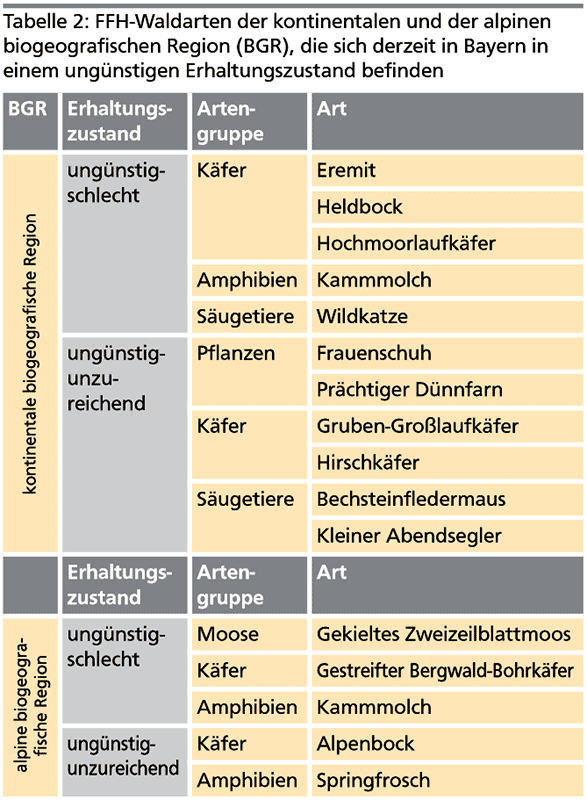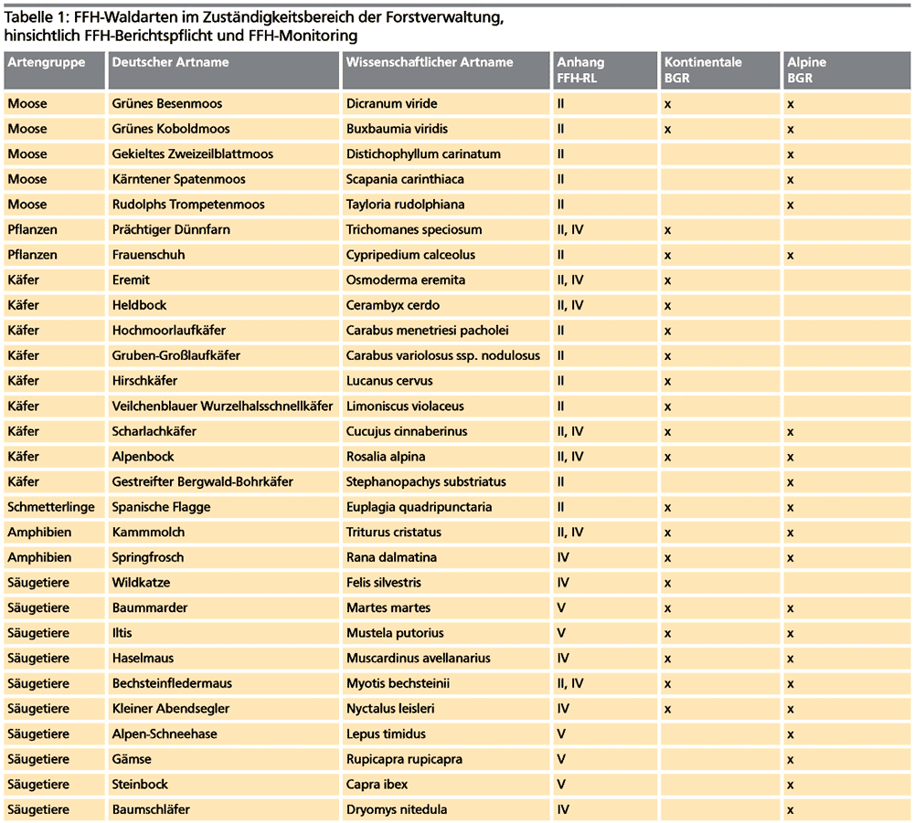 Die Bayerische Forstverwaltung verantwortet Berichterstellung und FFH-Monitoring für insgesamt 29 Waldarten aus verschiedenen taxonomischen Artengruppen (Tab. 1).