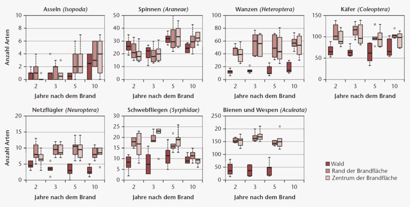 Im Gegensatz zu diesen bodenlebenden Arten kamen die Schwebfliegen (Bestäuber) zu Beginn in hoher Artenzahl vor, zeigten aber nach zehn Jahren Beobachtungszeit wieder ähnlich wenig Arten wie im Wald. Bei der zweiten Bestäubergruppe (Bienen und Wespen) bleibt unklar, ob die Artenzahl nach zehn Jahren ebenfalls wieder zurückgeht, da die Artbestimmung des letzten Jahres zum Zeitpunkt dieser Publikation noch nicht abgeschlossen war. Bei den anderen Gruppen, insbesondere bei den Wanzen und den räuberischen Netzflüglern, blieben die Artenzahlen über den ganzen Untersuchungszeitraum auf den Brandflächen deutlich höher als im angrenzenden Wald, und sie zeigten noch keine Tendenz zur Abnahme. Überraschend ist, dass es praktisch nie einen Unterschied zwischen der Artenvielfalt am Rand und im Zentrum der Brandfläche gab. Offenbar war die Wirkung des Feuers in beiden Bereichen ähnlich stark, und die Wiederbesiedlung von den angrenzenden Gebieten her erfolgte sehr schnell.