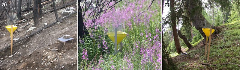Abb. 3 - Beispiele von Fallenstandorten a) im Zentrum der Brandfläche 2004, b) im Zentrum der Brandfläche 2006, c) im angrenzenden intakten Wald 2004. Jeder Standort enthält eine gelbe Kombifalle für Fluginsekten und eine Bodenfalle mit Plastikdach für auf der Bodenoberfläche aktive Arten. Anklicken zum Vergrössern. Fotos: Marco Moretti (WSL)